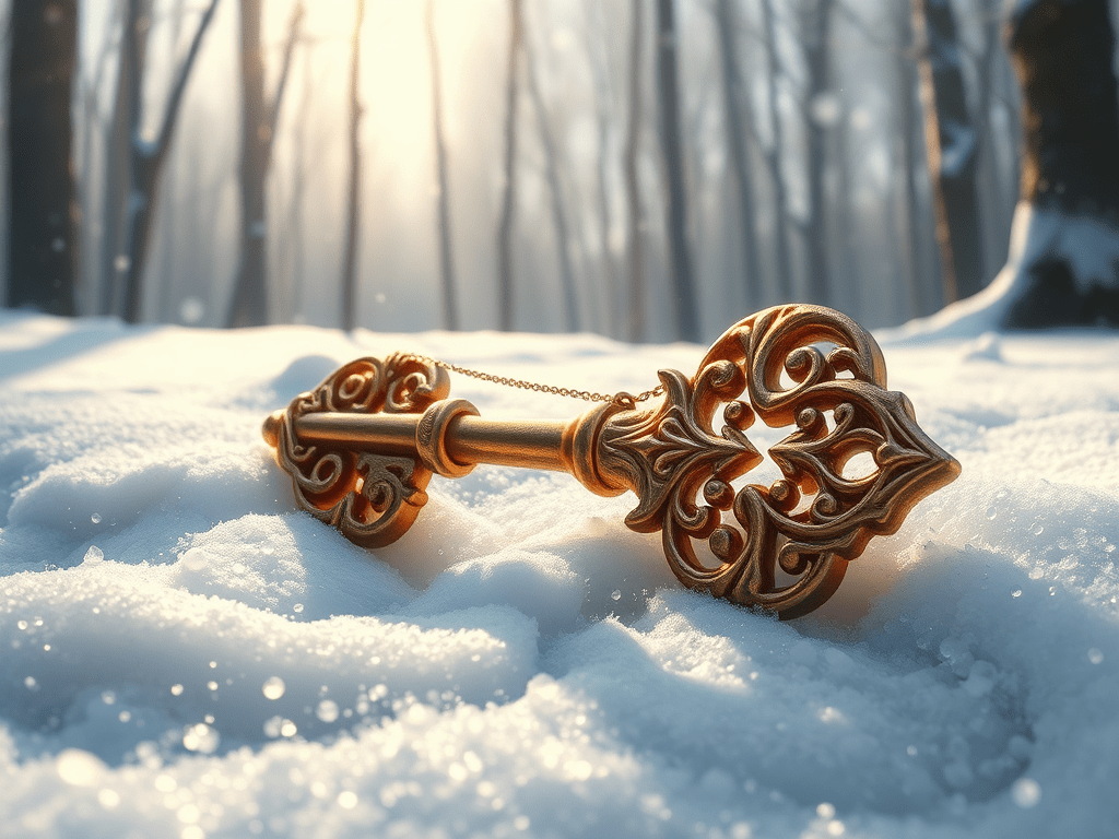 Scava nella gelida neve e infine trova una piccola scatola di ferro, e pensa che se riesce ad aprirla con la piccola chiave d’oro, troverà sicuramente qualcosa di valore.